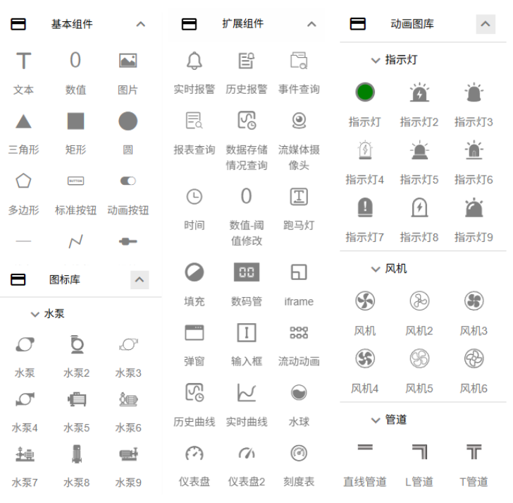 海量预置组件:涵盖工程设备智能化监控所需图表、仪表、设备图标、动画特效。